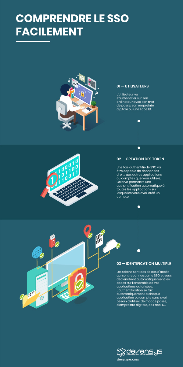 Le SSO simplifie donc grandement, la gestion de ses mots de passe. Utilisant souvent des cookies pour reconnaître les utilisateurs, c’est un annuaire qui envoie directement à une application donnée le mot de passe nécessaire. L’utilisateur n’est donc plus obligé d’intervenir sur chaque application différentes. La solution d’identifiant ou de signature unique élimine tout besoin pour les utilisateurs de se souvenir de plusieurs processus de connexion, de plusieurs identifiants ou mots de passe. En regroupant l’ensemble des mots de passe sur une seule et unique authentification, le SSO augmente en revanche l’importance et le volume des données pouvant être volées en cas de piratage du mot de passe d’authentification. Des entreprises comme Evidian, Synetis ou Enovacom proposent des solutions de type SSO.