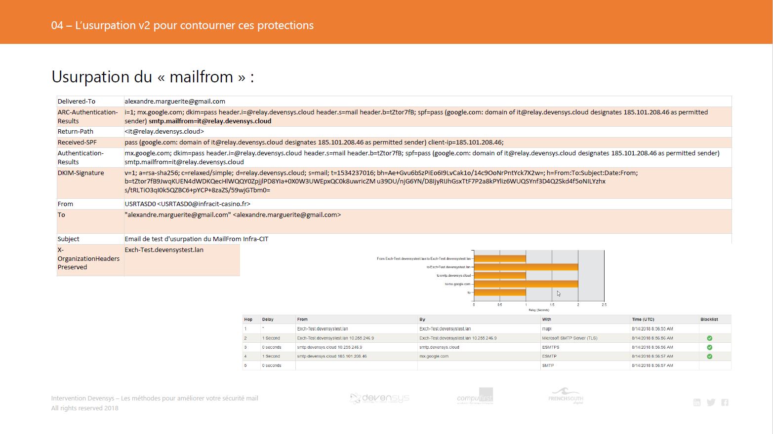 Le mail n’ayant eu aucune protection lors de sa création, le protocole SPF et DKIM ont été créés. Lorsqu’ils se sont rendus compte qu’il y avait moyen de les contourner, une nouvelle norme, le DMARC (domain-based message authentication reporting and conformance), a été développé afin de « patcher » les failles des protocoles précédents. Il va s’occuper de vérifier si les contenus du « mailfrom » et du «from» sont alignés. Cela correspond à l’enveloppe et au contenu. Si les deux contenus n’ont rien à voir, alors c’est qu’il y a un problème. Il va regarder si le SPF et le DKIM sont présents dans ces deux contenus, et non pas dans un seul. A l’origine, cette vérification supplémentaire n’était pas réalisée et seul le mailfrom était inspecté. Le DMARC offre donc un niveau de protection optimal à l’utilisateur. Il vient renforcer les deux protocoles précédents.