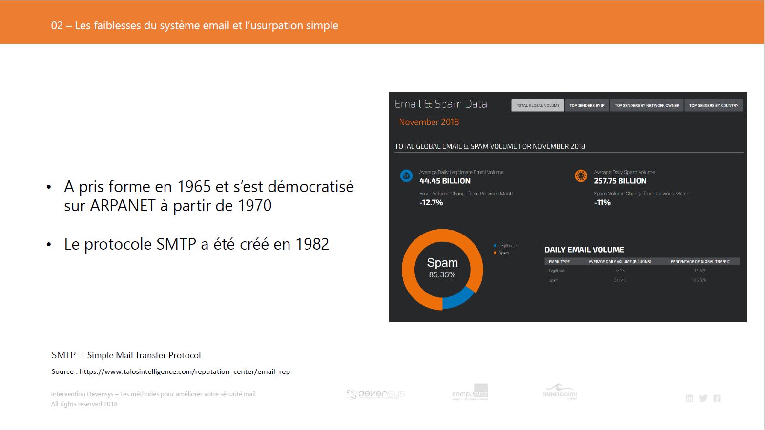 Jeudi 13 décembre 2018, nous avons pu intervenir dans les locaux de Cap Oméga Montpellier grâce à Frenchsouth.digital, sur le sujet de la sécurité des emails. Nous remercions les personnes qui ont pu être présentes ainsi que nos partenaires Frenchsouth.digital et Compufirst. Notre intervenant Alexandre Marguerite, Directeur Technique et Associé chez Devensys, a pu parler de la sécurité email en général et notamment du phishing, usurpation d’identité, ransomware.