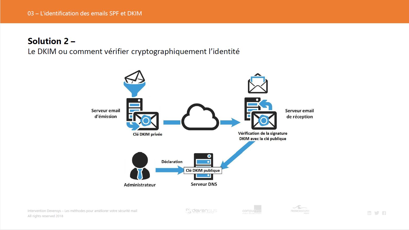 C’est pour cela que le protocole DKIM a été également conçu, il offre un autre niveau de sécurité. Il s’agit tout simplement de cryptographie, à savoir une signature numérique qui va être mise sur votre DNS. C’est une clé privée, connue uniquement de votre serveur. Si une fois que vous recevez le mail il n’est pas reconnu avec la bonne clé, alors le mail ne sera pas considéré comme légitime. En comparaison, il s’agirait du tampon que l’on mettrait sur une lettre, permettant d’identifier sa provenance et sa légitimité.
