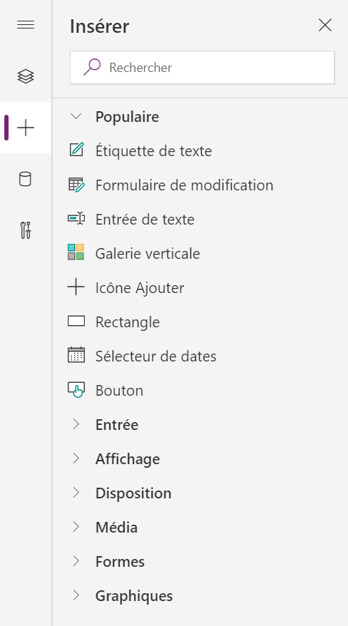 En plus des templates, Power Apps propose son lot de « composants ». Ce sont des éléments qui vont être utilisés pour construire l’application. On y retrouve les éléments classiques d’affichage tel que bouton, champs texte, images, etc. Certains composants plus complexes ont aussi été prévus: liste de données avec champs de recherche, carte Bing, et bien d’autres.