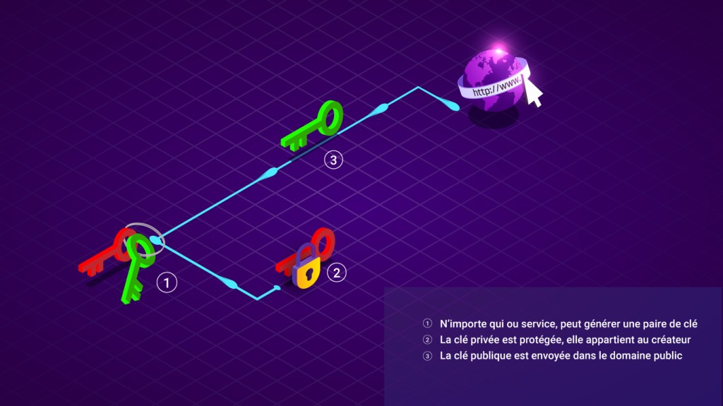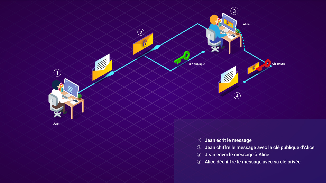 Le chiffrement asymétrique, quant à lui, va reposer sur la génération non pas d’une mais de deux clefs. Ces clefs sont appelées clef privée et clef publique. La clef privée a, comme son nom l’indique, pour principe d’être à l’usage exclusif d’une personne ou service. On va ainsi chiffrer les communications vers cette personne / ce service.