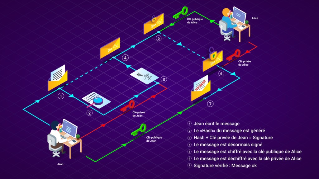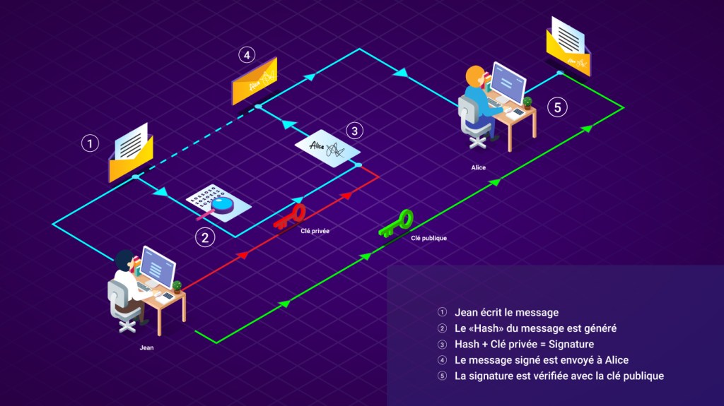Une fois le message établi, on va utiliser un algorithme de hash afin de garantir l’intégrité du message. Puis on va utiliser une fonction de signature à partir de la clef privée de l’expéditeur sur ce hash. Le résultat sera alors envoyé avec le message. Le destinataire va alors vérifier la signature via la clef publique de l’expéditeur. Si c’est valide, alors on prouve ainsi que le message n’a pas été altéré, et que c’est bien l’expéditeur qui l’a envoyé.